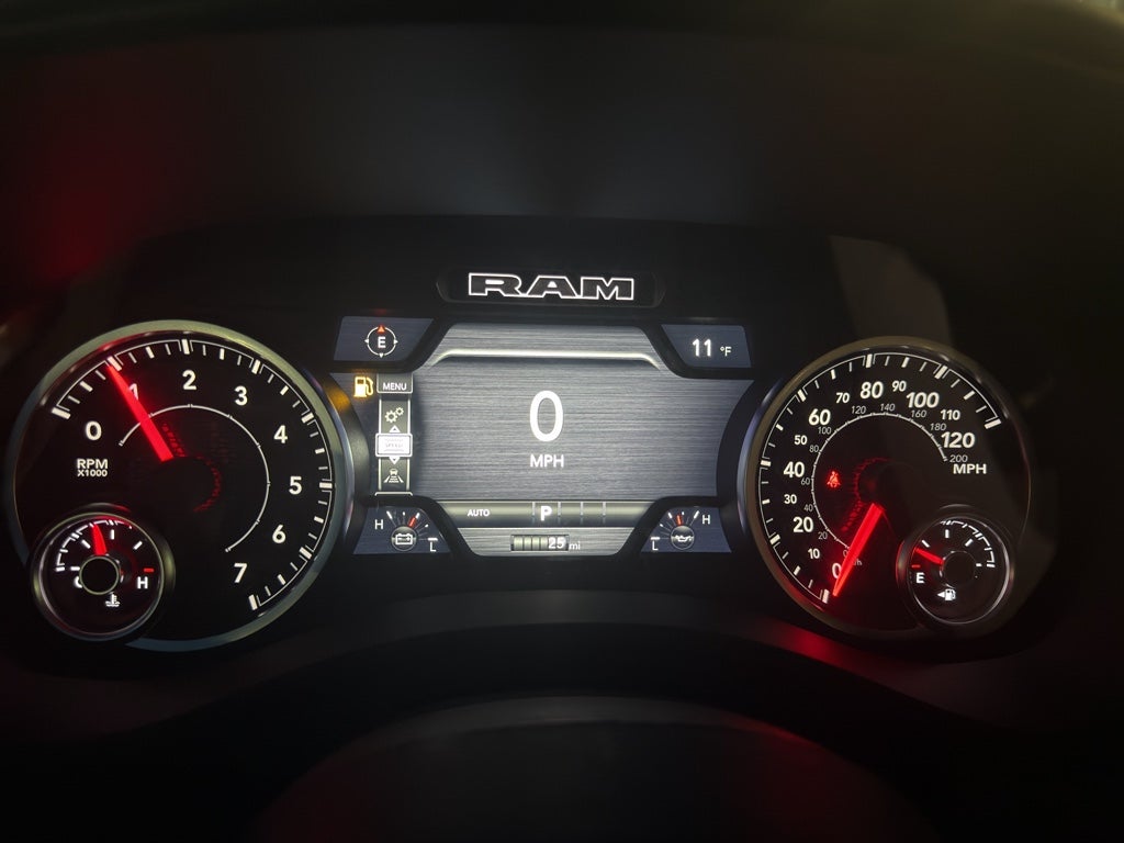 This vehicle's Forward Collision Warning system alerts the driver to potential front-end collisions, enhancing safety. This unit is pure luxury with a heated steering wheel. Never get into a cold vehicle again with the remote start feature on the vehicle. The vehicle features a hands-free Bluetooth® phone system. It offers Apple CarPlay for seamless connectivity. Protect this Ram 1500 from unwanted accidents with a cutting edge backup camera system. The vehicle offers Automatic Climate Control for personalized comfort. The state of the art park assist system will guide you easily into any spot. The installed navigation system will keep you on the right path. with XM/Sirus Satellite Radio you are no longer restricted by poor quality local radio stations while driving the Ram 1500. Anywhere on the planet, you will have hundreds of digital stations to choose from. This Ram 1500 has automated speed control that adjusts to maintain a safe following distance, enhancing highway driving convenience.