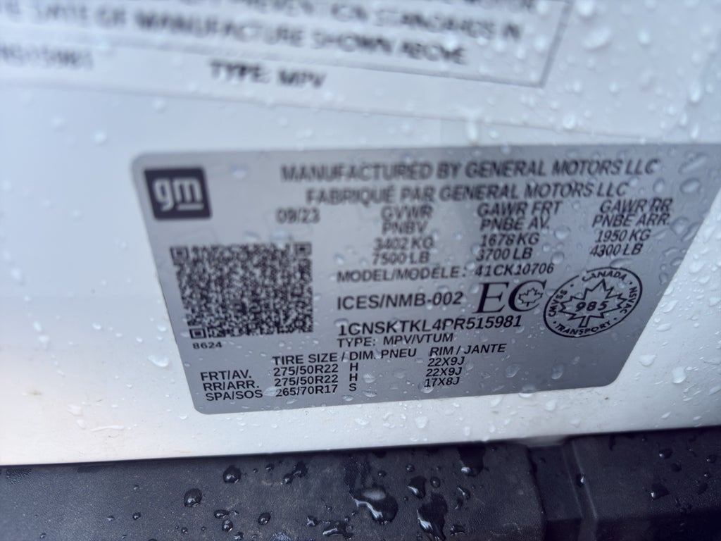 Max Trailering Package: Extra Capacity Cooling System. Advanced Trailering Package: Trailer Side Blind Zone Alert; Smart Trailer Integration Indicator; Integrated Trailer Brake Controller; Hitch Guidance with Hitch View. High Country Deluxe: Dual-Pane Power Panoramic Sunroof; Air Ride Adaptive Suspension; Power-Retractable Assist Steps. Preferred Equipment Group 3LZ: Bright Front and Rear Door Sill Plates; Memory Settings; Perforated Leather Seat Trim; Remote Start; 3.23 Rear Axle Ratio; 3rd Row 60/40 Power-Folding Split-Bench Seat; Safety Alert Seat; Chrome Door Handles with Body-Colour Strip; Hill Descent Control; 6.2L EcoTec3 V8 Engine; Rear Camera Mirror Washer; Inside Rearview Auo-Dimming Rear Camera Mirror; 3. 402 Kgs (7. 500 Lbs) GVWR; Heated Steering Wheel; LED Daytime Running Lamps; Wheels: 22" X 9" Sterling Silver Premium Painted; Rear Cross Traffic Alert; Electronic 10-Speed Automatic Transmission with Overdrive; Driver and Front Outboard Passenger Airbags; Wireless Charging; Front High-Back Reclining Bucket Seats; Universal Home Remote; Colour-Keyed Carpeting Floor Covering; Heated 2nd Row Outboard Seats; Hands-Free Rear Power Programmable Liftgate; Chevrolet Infotainment 3 Premium System Radio; 2-Speed Active Electronic Autotrac Transfer Case; 1st and 2nd Row Colour-Keyed Carpeted Floor Mats; Enhanced Driver Information Centre; Floor Console; Lane Change Alert with Side Blind Zone Alert; Dual Exhaust System; SiriusXM Radio with 360L; HD Surround Vision; Wrapped Steering Wheel; Power Tilt and Telescopic Steering Column; 15" Diagonal Multi-Colour Head-Up Display; Rear Pedestrian Alert; Bose 10-Speaker Centerpoint Surround Audio System Feature; Magnetic Ride Control Suspension; Infotainment Display; Power Release 2nd Row Bucket Seats; 275/50R22SL AS BW Tires; Enhanced Automatic Emergency Braking; Outside Heated Power-Adjustable Mirrors. Power-Retractable Assist Steps. Dual-Pane Power Panoramic Sunroof. Air Ride Adaptive Suspension. **Equipment listed is based on original vehicle build and subject to change. Please confirm the accuracy of the included equipment by calling the dealer prior to purchase.**